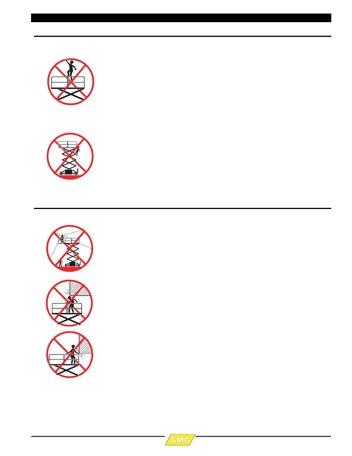 DO NOT sit, stand or climb on the platform guard rails. Maintain a firm footing on the