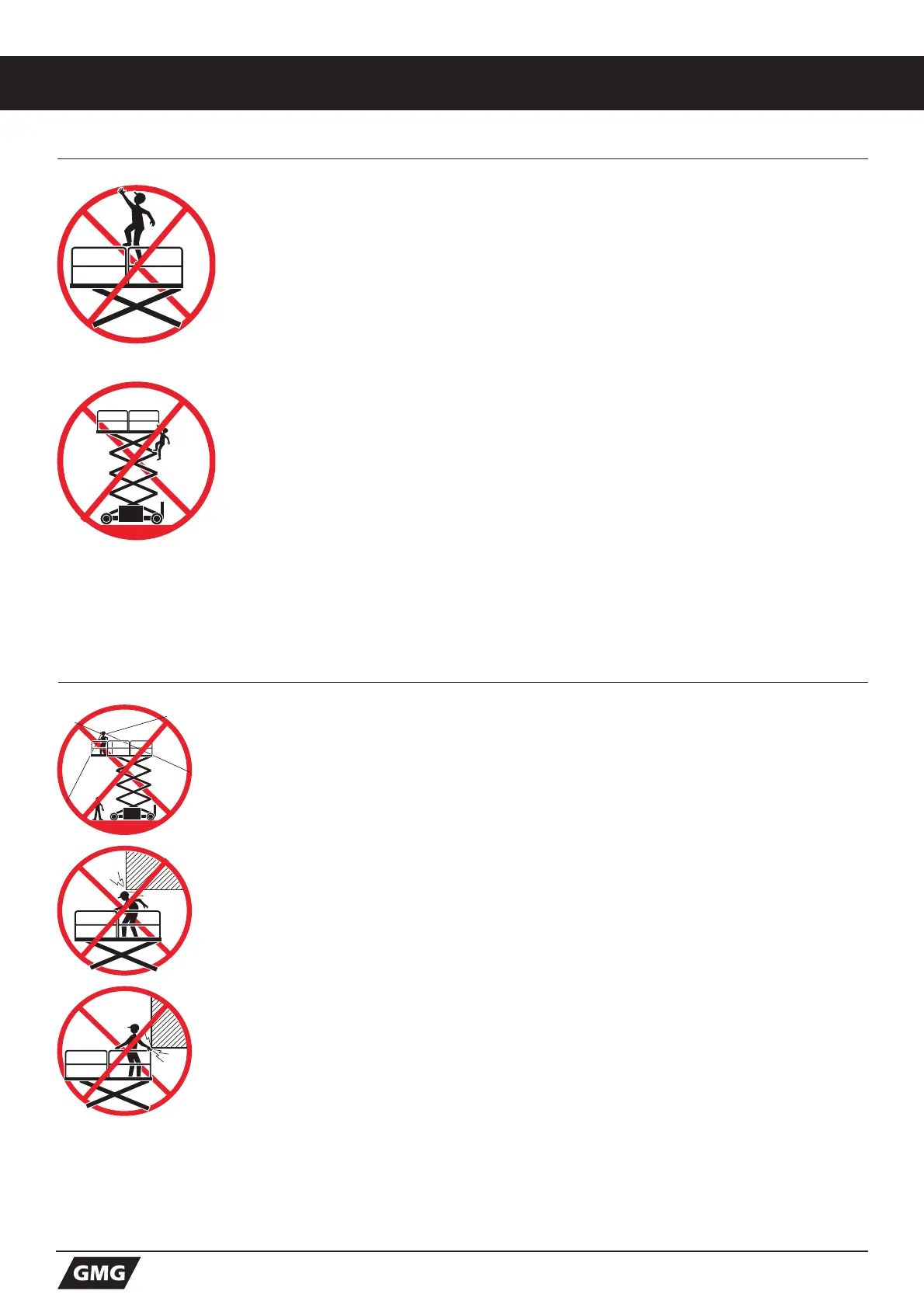 DO NOT exit the platform when elevated Keep the platform floor clear of debris.