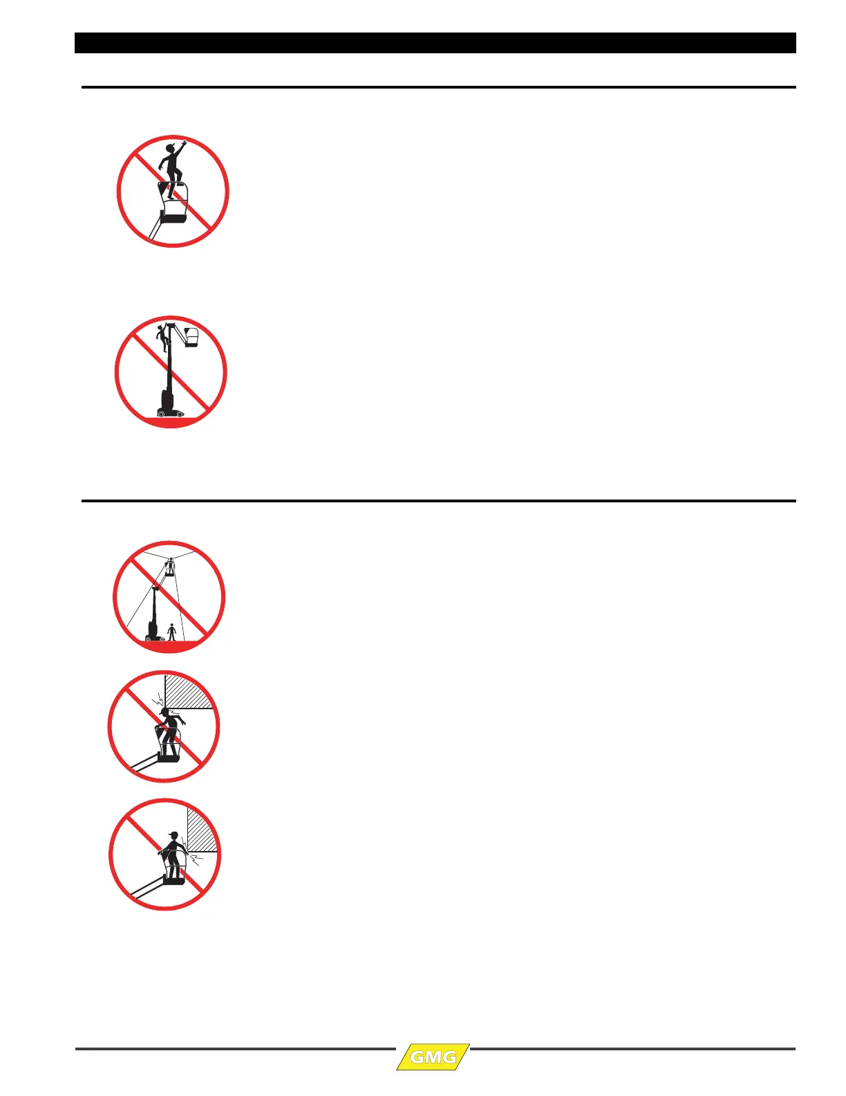 DO NOT sit, stand or climb on the platform guard rails. Maintain a firm footing on the