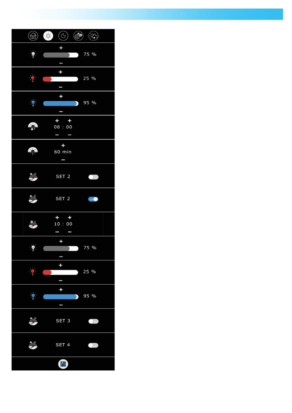 Mediante tasti per incrementare (+) e diminuire (-), impostare intensità del canale led
