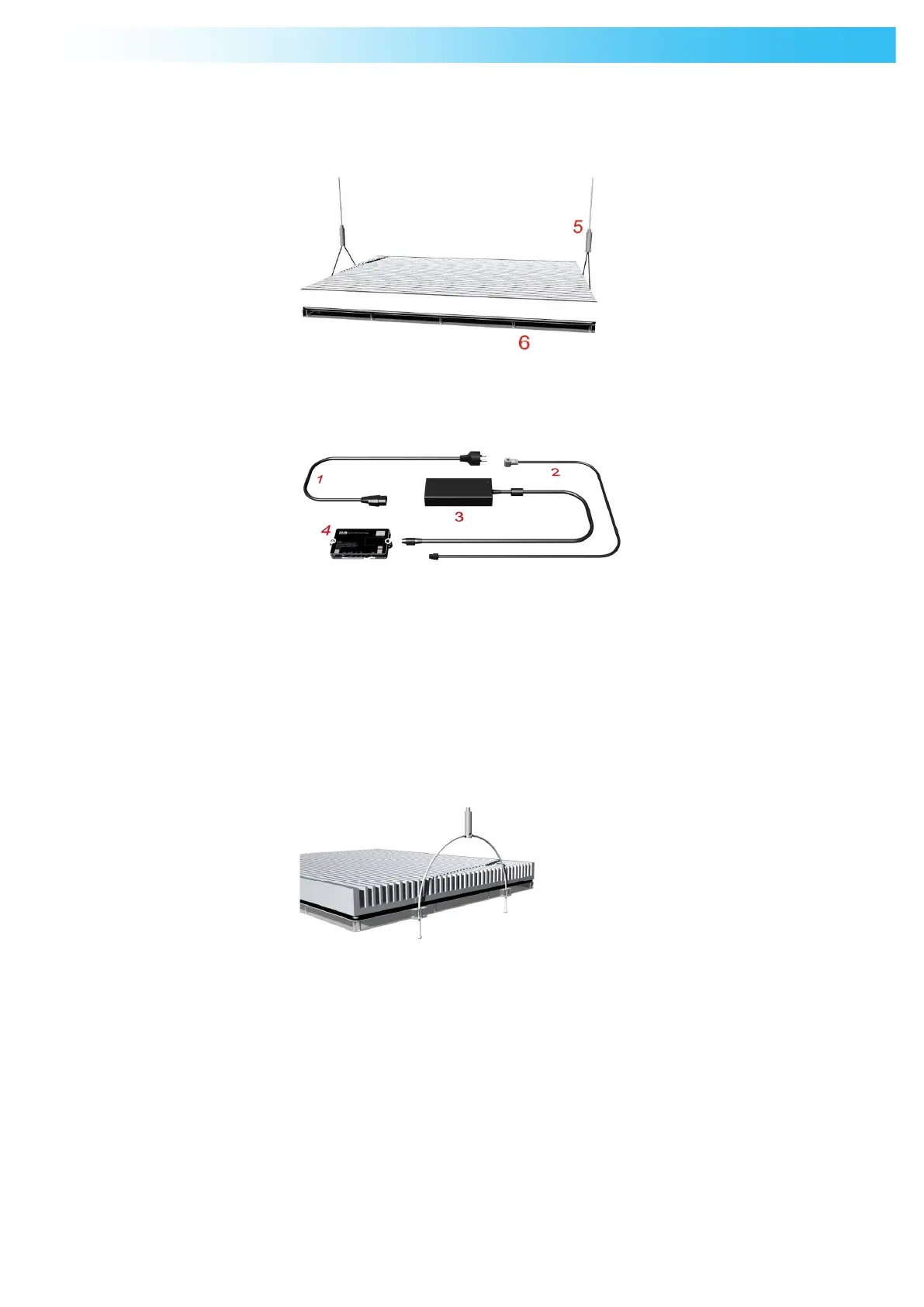 Body of the lamp (6), Cables and supports for fixing (5), Power cable (1), Power supply with cable (3), Controller AirLink WiFi (4), lamp cable (2).