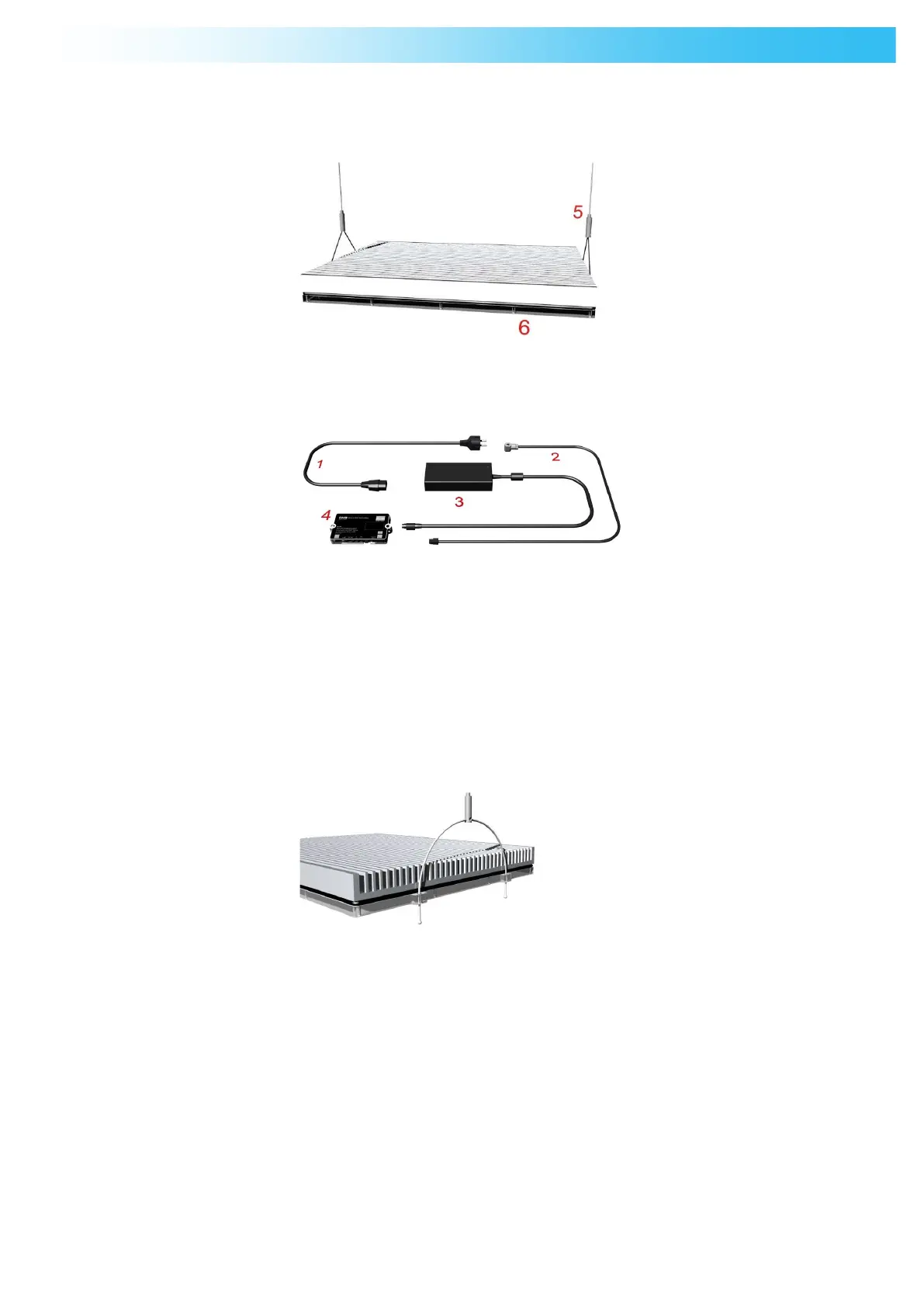 Das Gerät besteht aus: Lampenkörper (6), Kabel und Halterungen zur Deckenbefestigung (5), Stromkabel (1), Netzteil mit Kabel (3), AirLink Wi-Fi