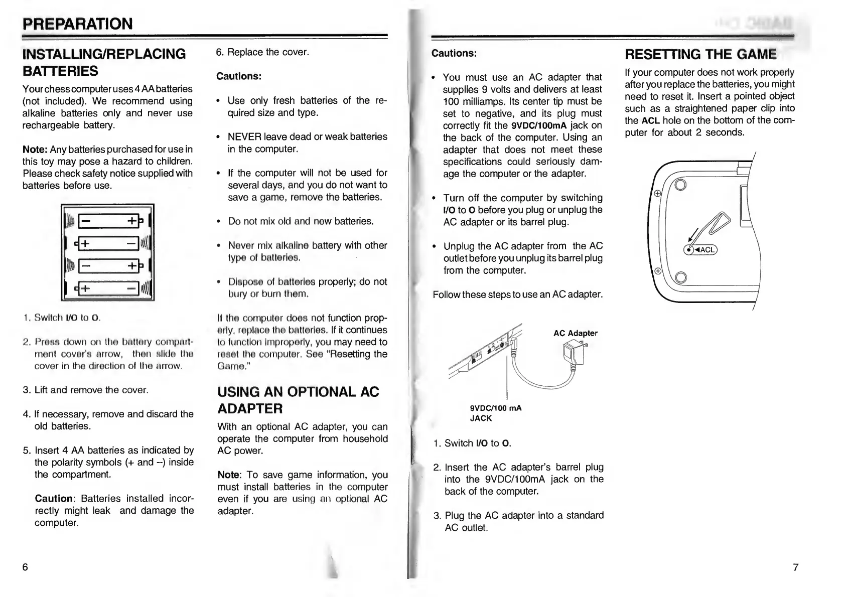 Go Partner 1680X - PREPARATION; Installing;Replacing Batteries; Using an Optional AC Adapter; Resetting the Game