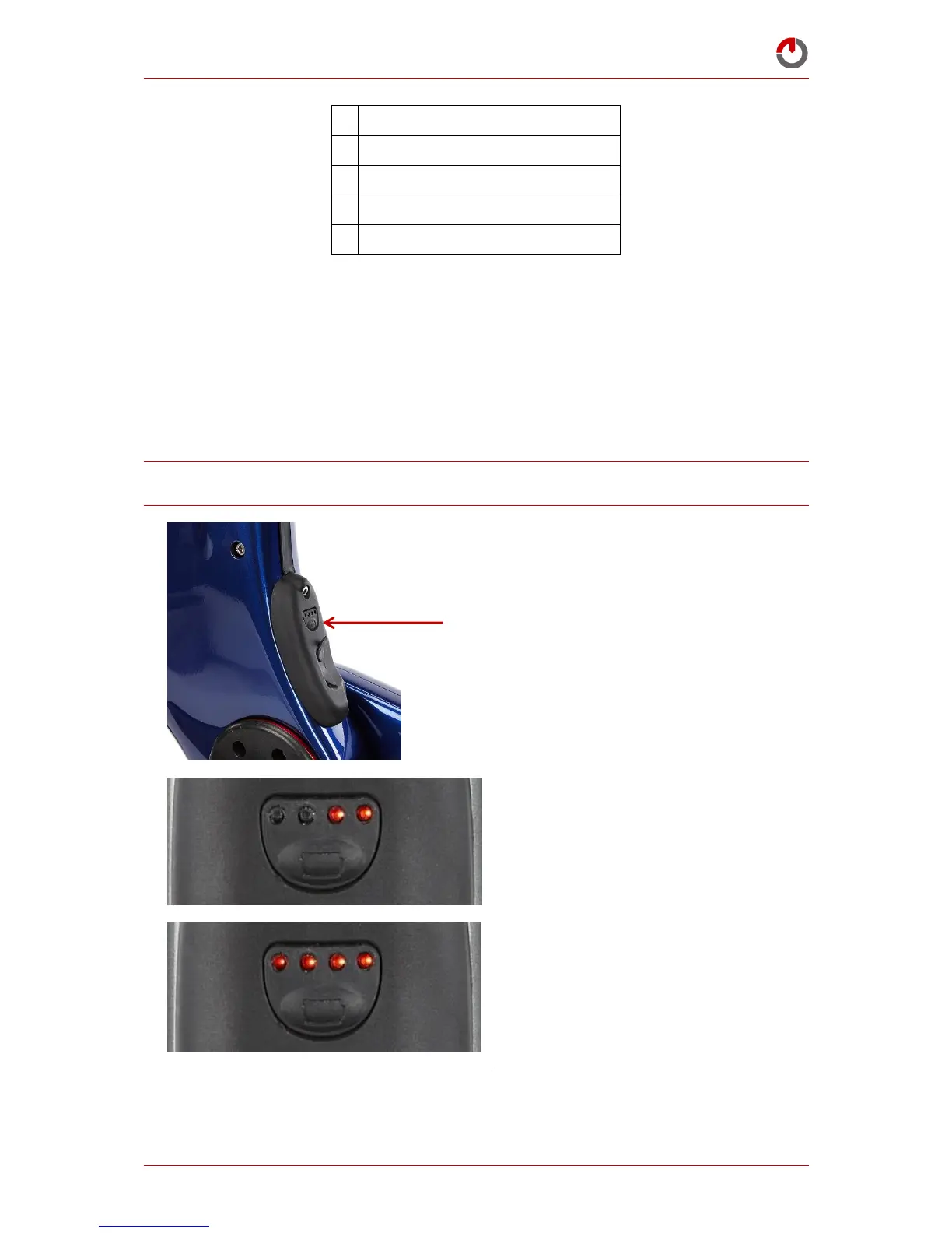 LEDs displayed accordingly. The Battery Low Level Indicator is represented by one flashing LED.