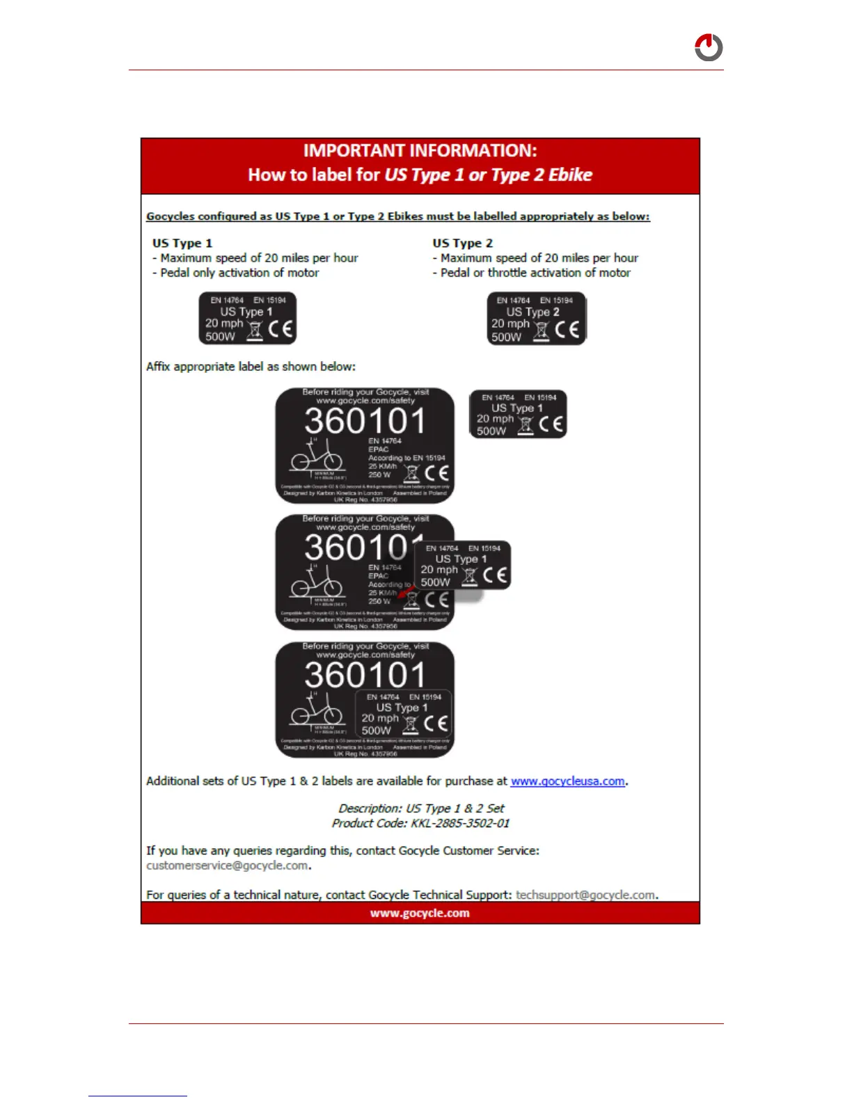 Gocycle GS - Labelling for USA Type 1 & Type 2 Configuration