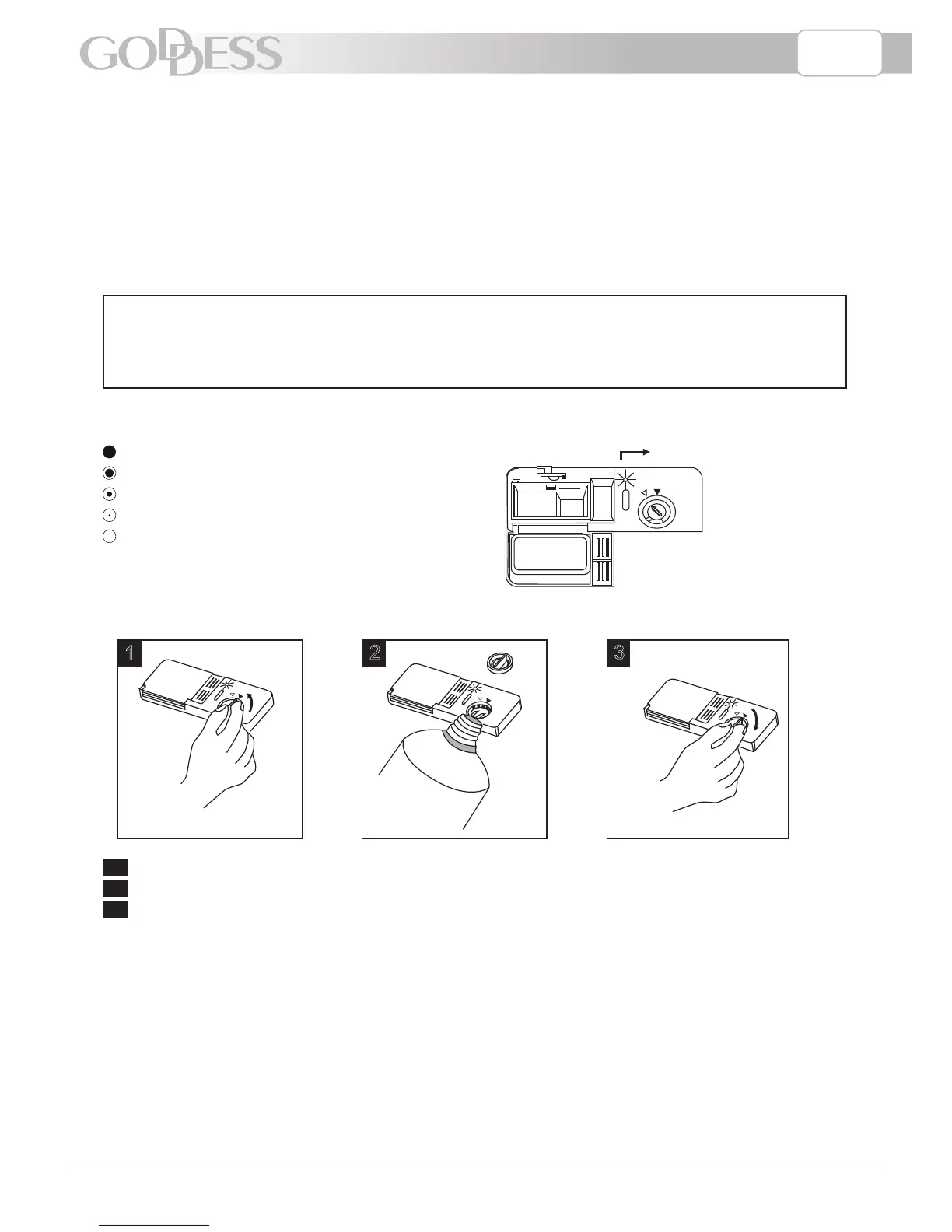 by the color of the optical level indicator „D“ located next to the cap. When the rinse-aid