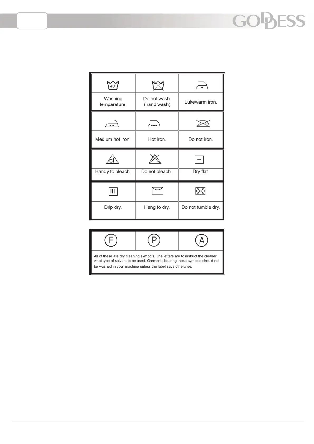 Goddess WFE1015M8 - Section 10: International Washing Signs