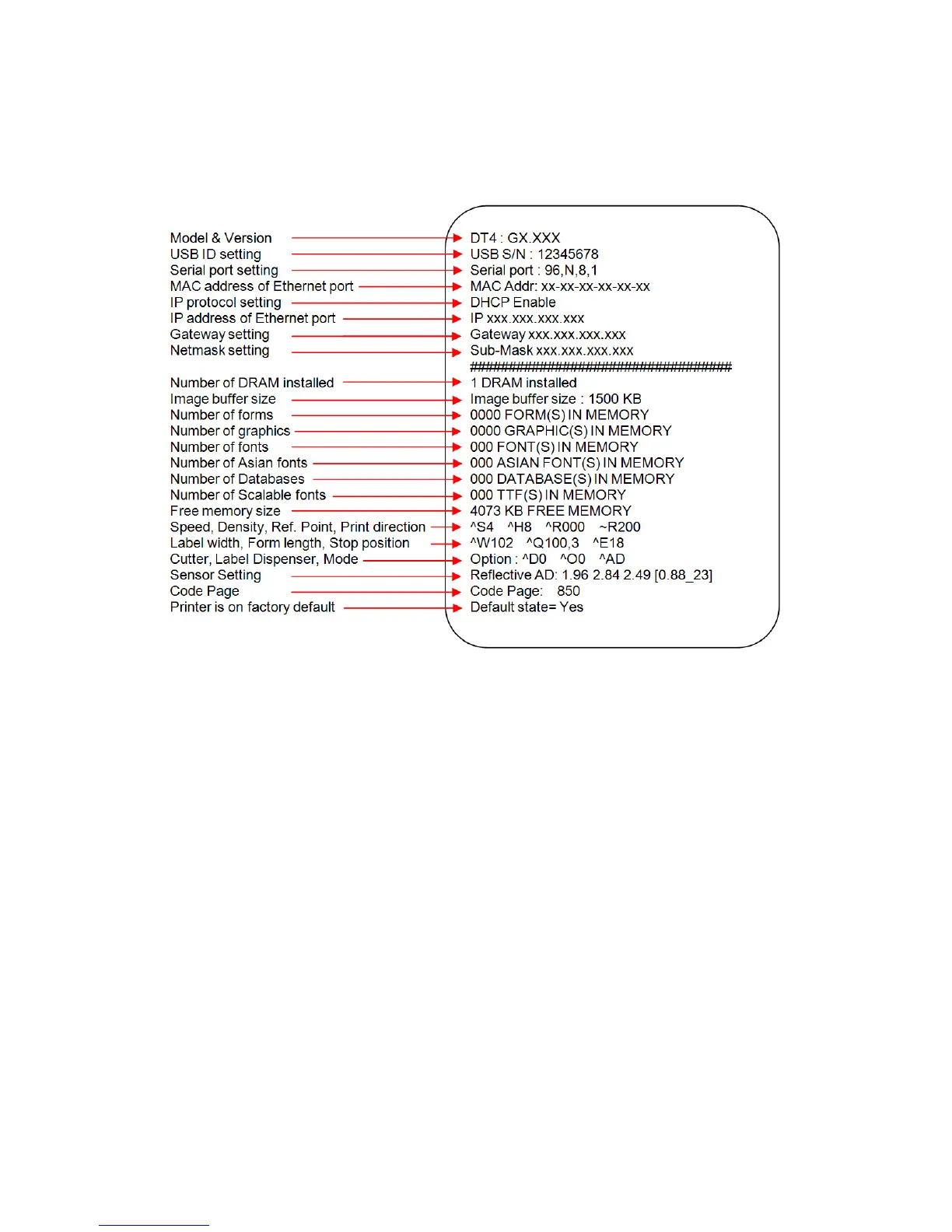 The printer prints the following test page: