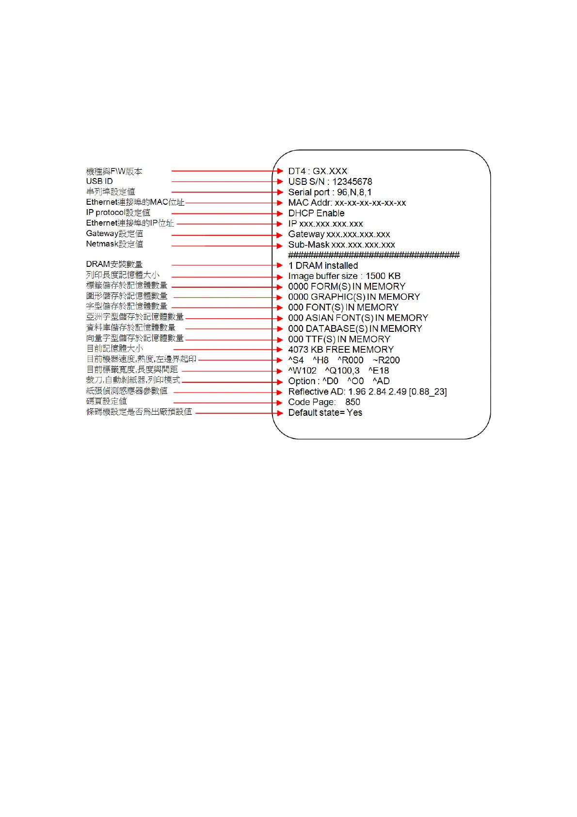 條碼機的自我測試頁內容可幫助使用者檢查條碼機本身是否正常無故障自我測試頁各項內容的