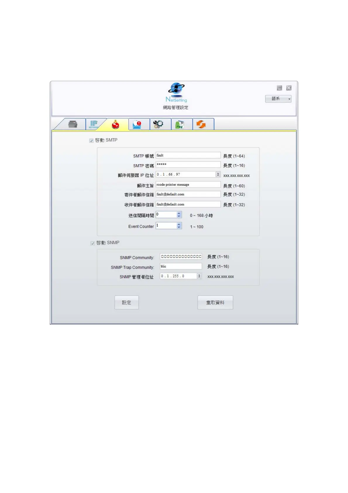 當印表機發生錯誤時,NetSetting可將警告訊息發送到您指定的郵件位址。警告訊息可經由SMTP