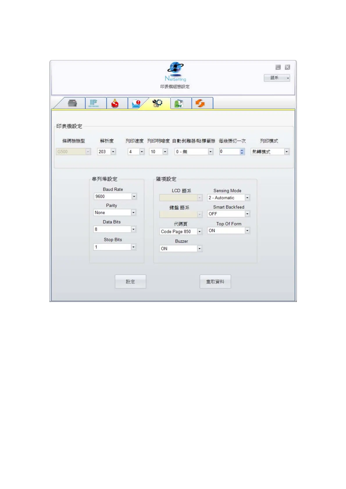 按下設定鍵可以使設定值生效,按下重取資料鍵則可以更新目前設定的數值