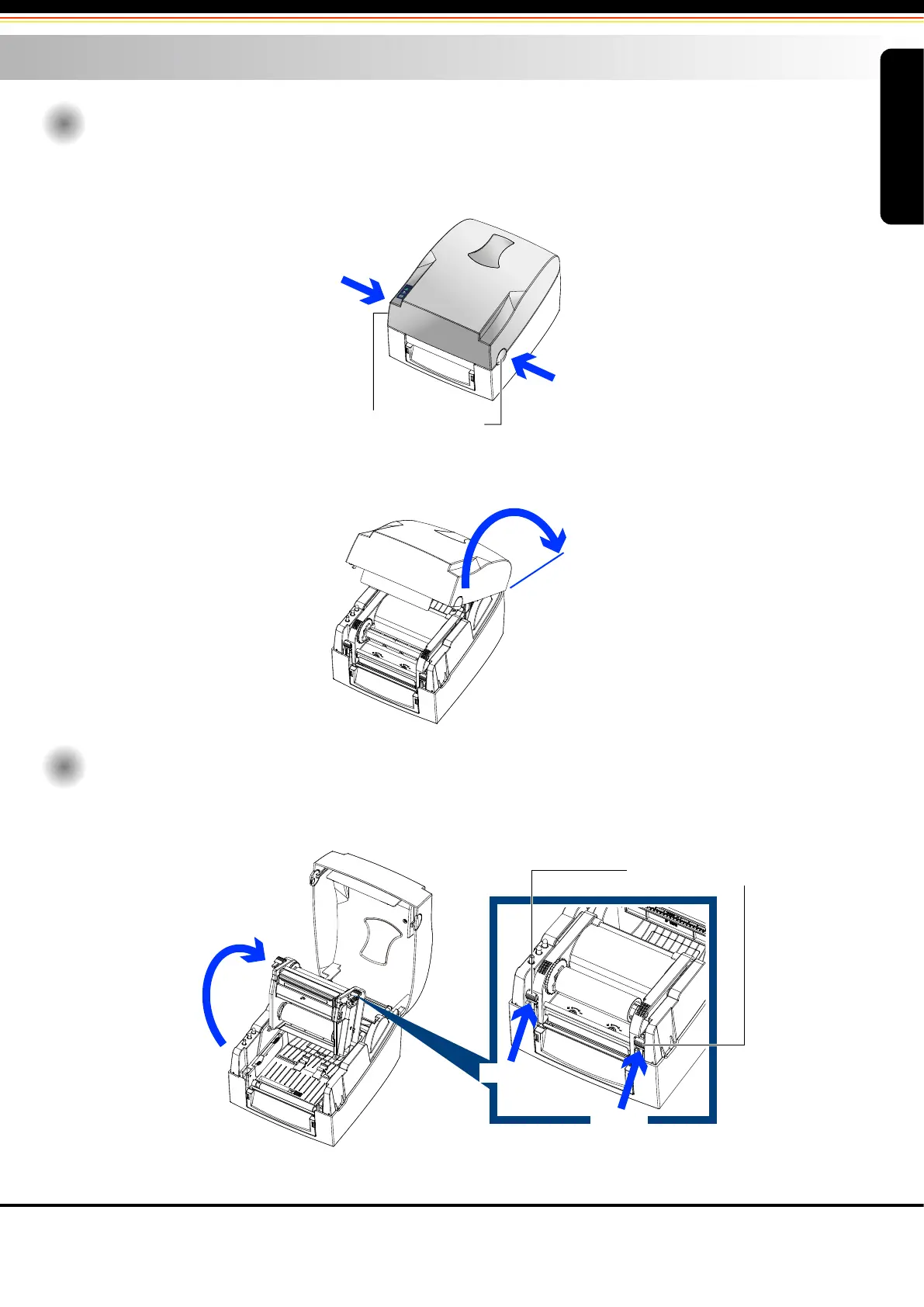 Place the printer on a flat surface. Open the printer cover by pressing the release buttons on both sides of the