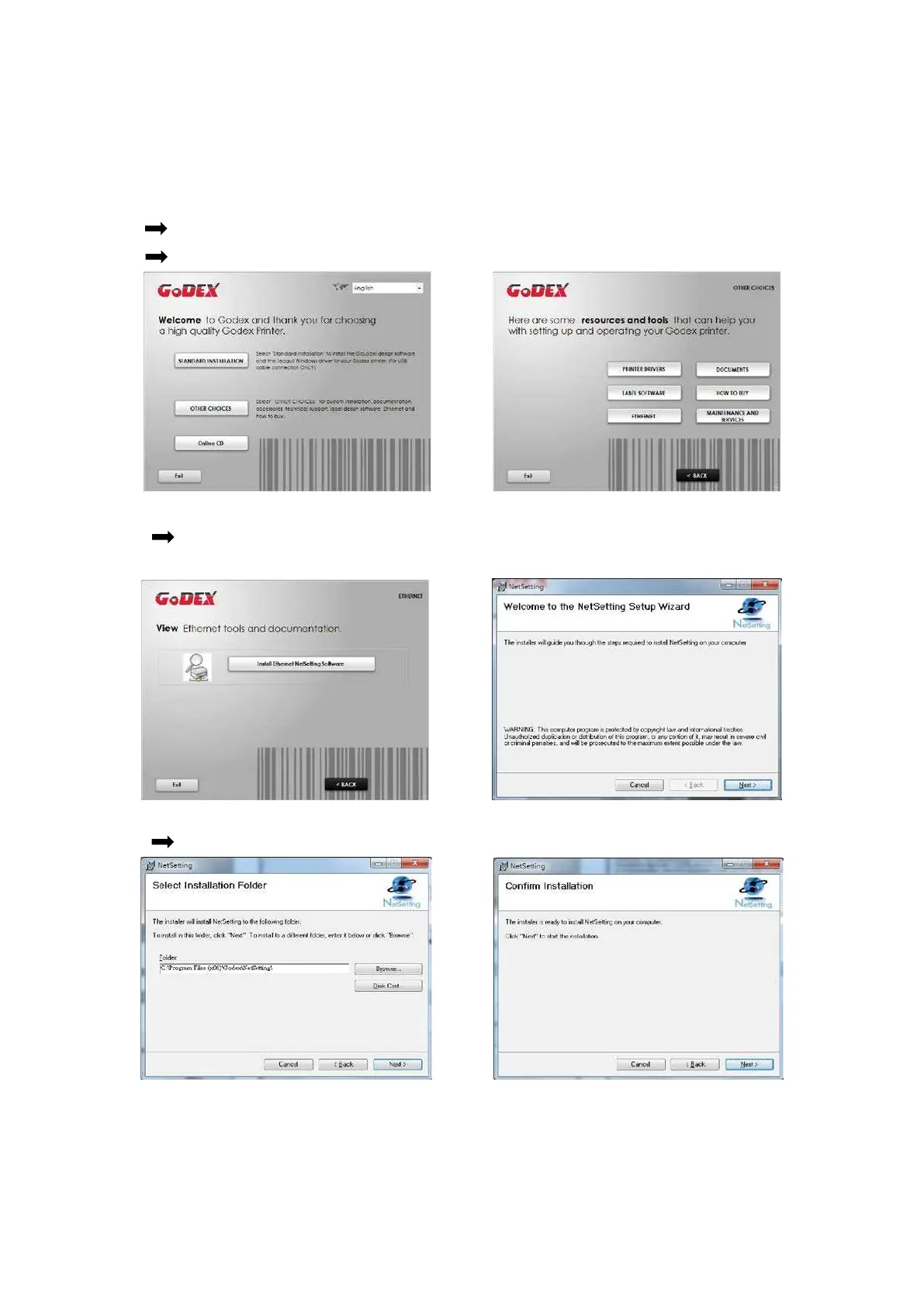 Ste p.03 C lic k "Insta ll Ethe rne t Ne tSe tting So ftwa re ", insta lla tio n sc re e n a s rig ht d ia g ra m, c lic k