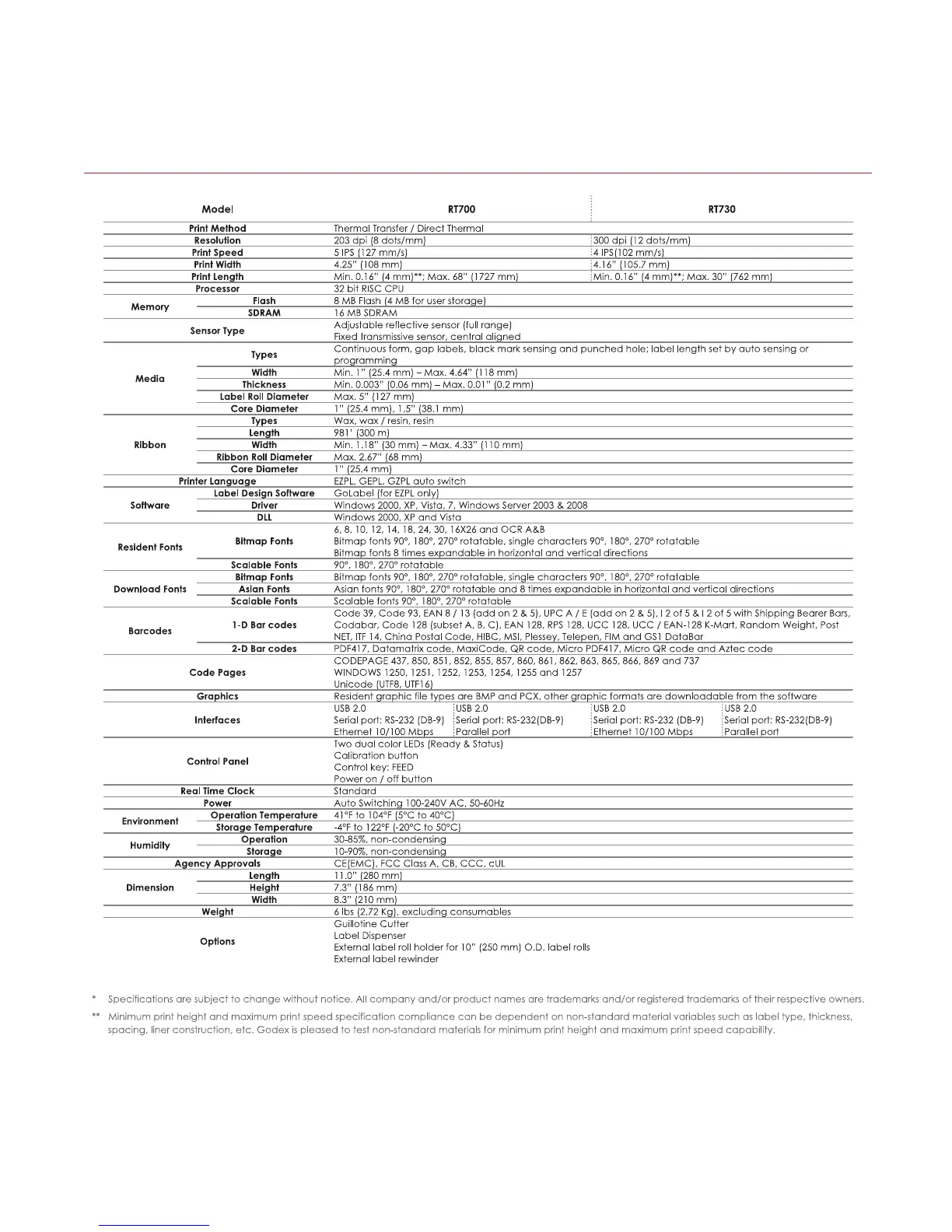 Godex RT700 - Appendix: Product Specifications; Product Specifications