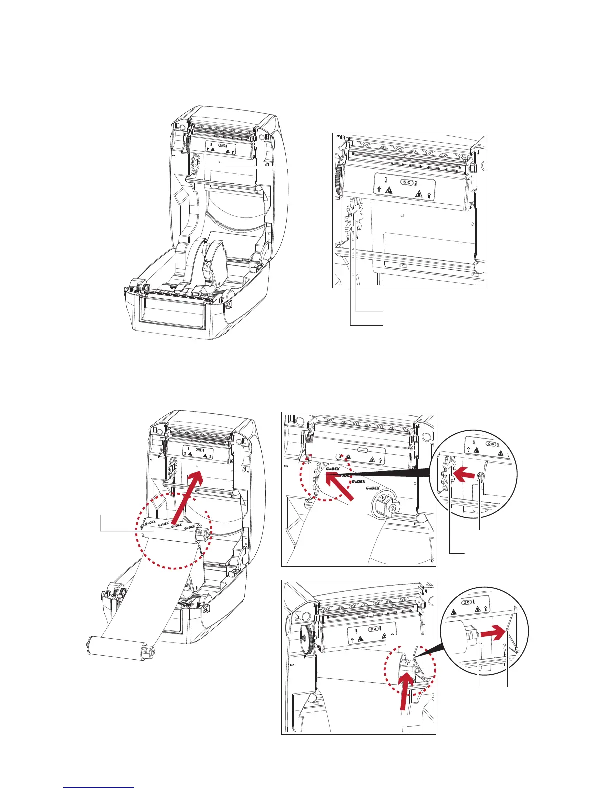 1. Place the ribbon supply module into the printing mechanism. Please the left-hand side of ribbon hub first.