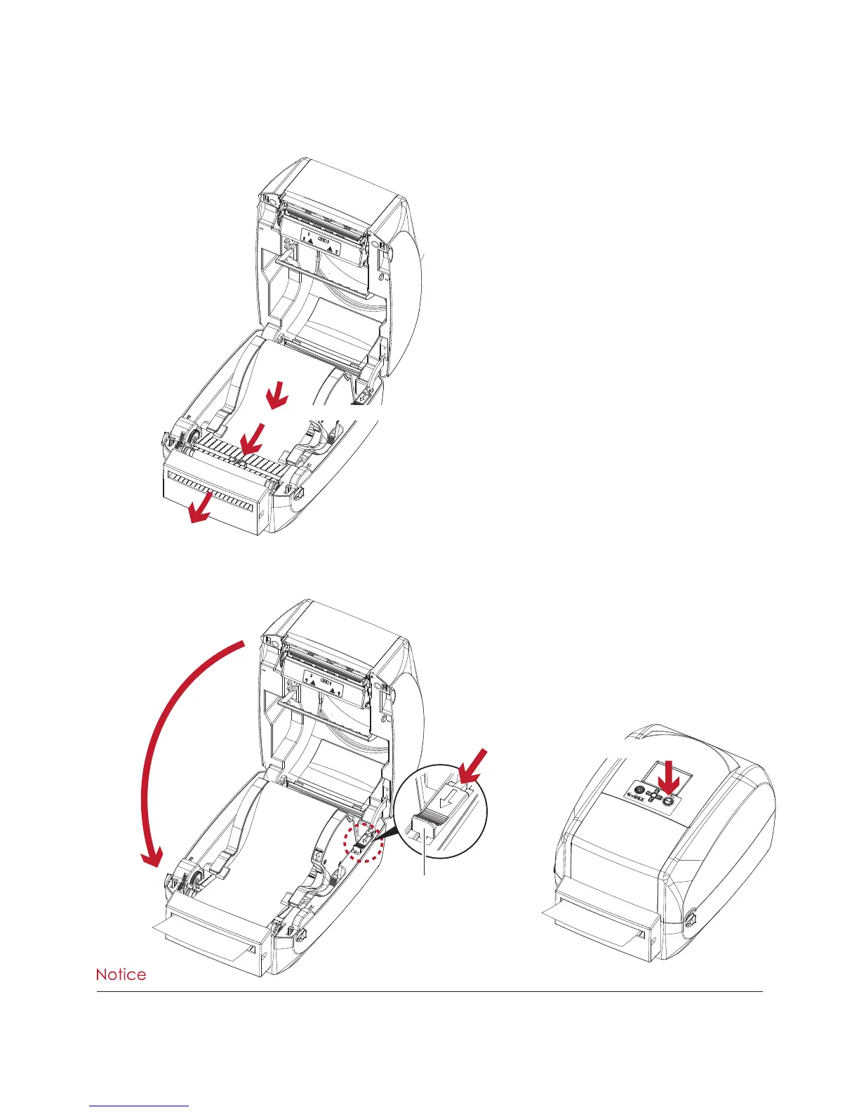 2. Close the top cover and printing mechanism. To finish, press the FEED button to set the label position.