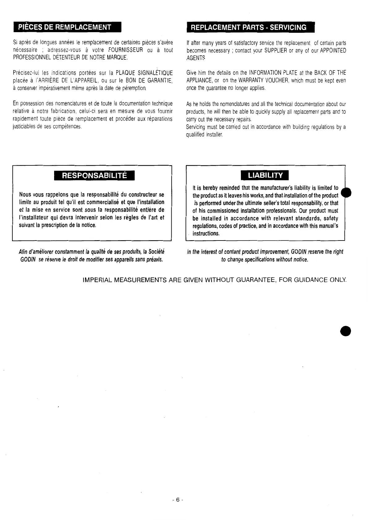 Godin REGENCE - Maintenance and Parts; Replacement Parts; Manufacturer Liability