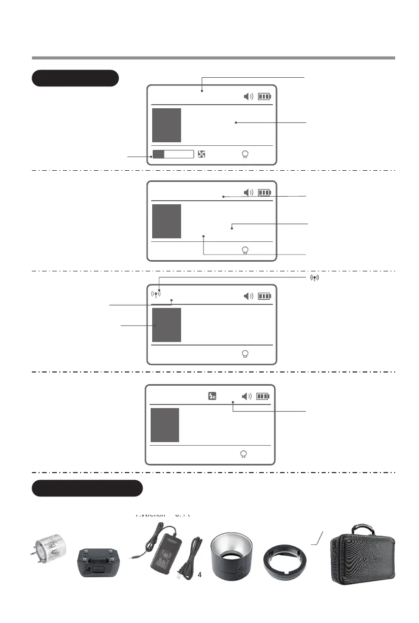 6.Bowens-mount adapter ring 7.Wrench 8. Portable Bag 9. Instruction manual