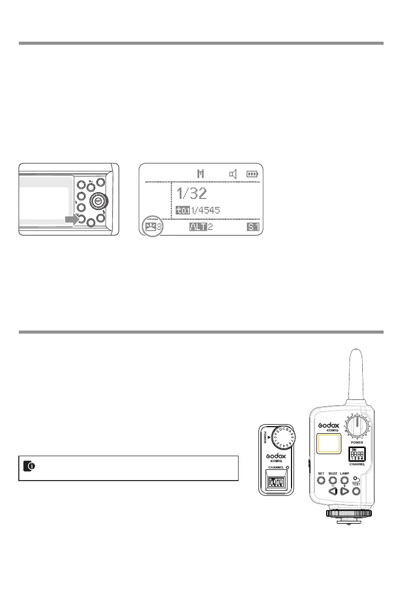on the flash and insert the transmit end into the camera hot shoe. Settings