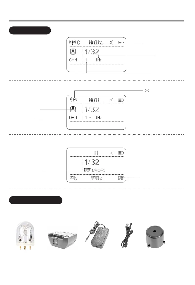 1. Flash tube 2. Lithium battery pack 3.Battery charger 4. Power cord 5. Lamp cover 6. Instruction manual