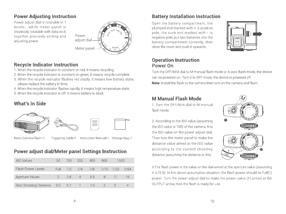 Godox Lux Junior - Power Adjusting Instruction; Power Adjust Dial and Meter Panel Settings; Settings Table; Operation Instructions