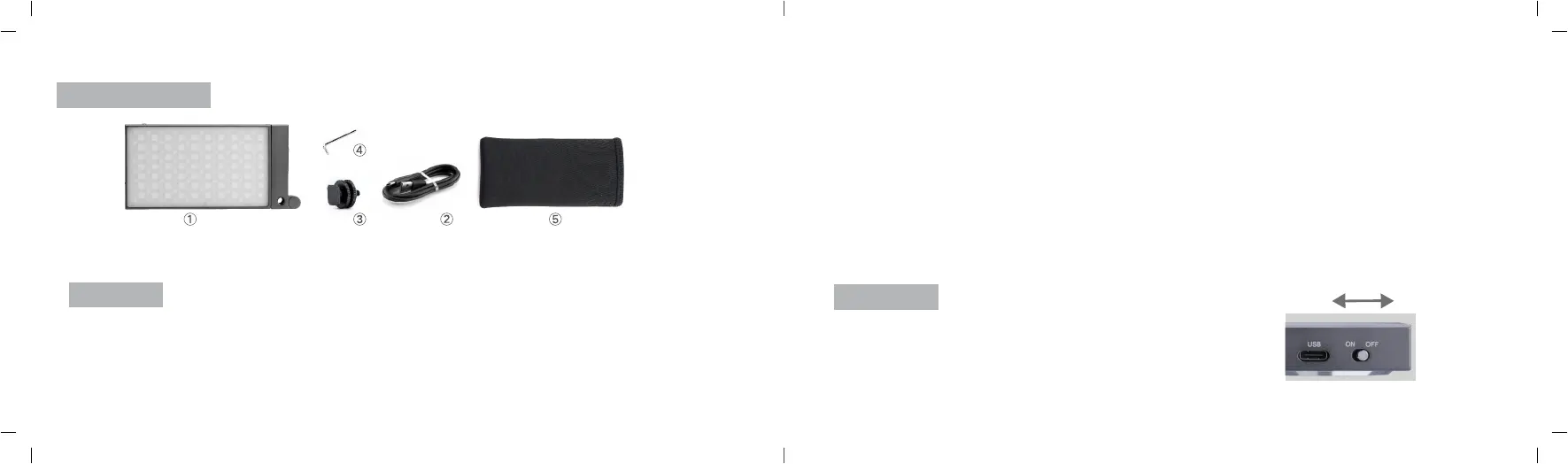 1. Light body 2. Type-C USB cable 3. Cold shoe 4. Wrench 5. Portable bag 6. Instruction manual