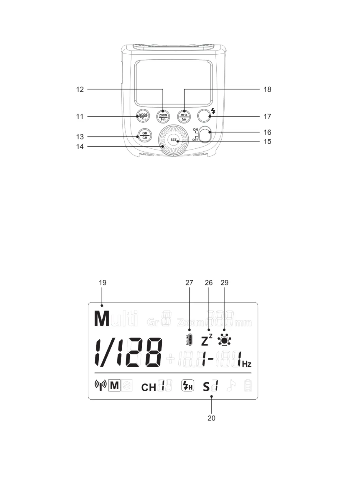 18. Fókusz segédsugár/nagysebességű szinkronizáló gomb (hosszú billentyűnyomás)