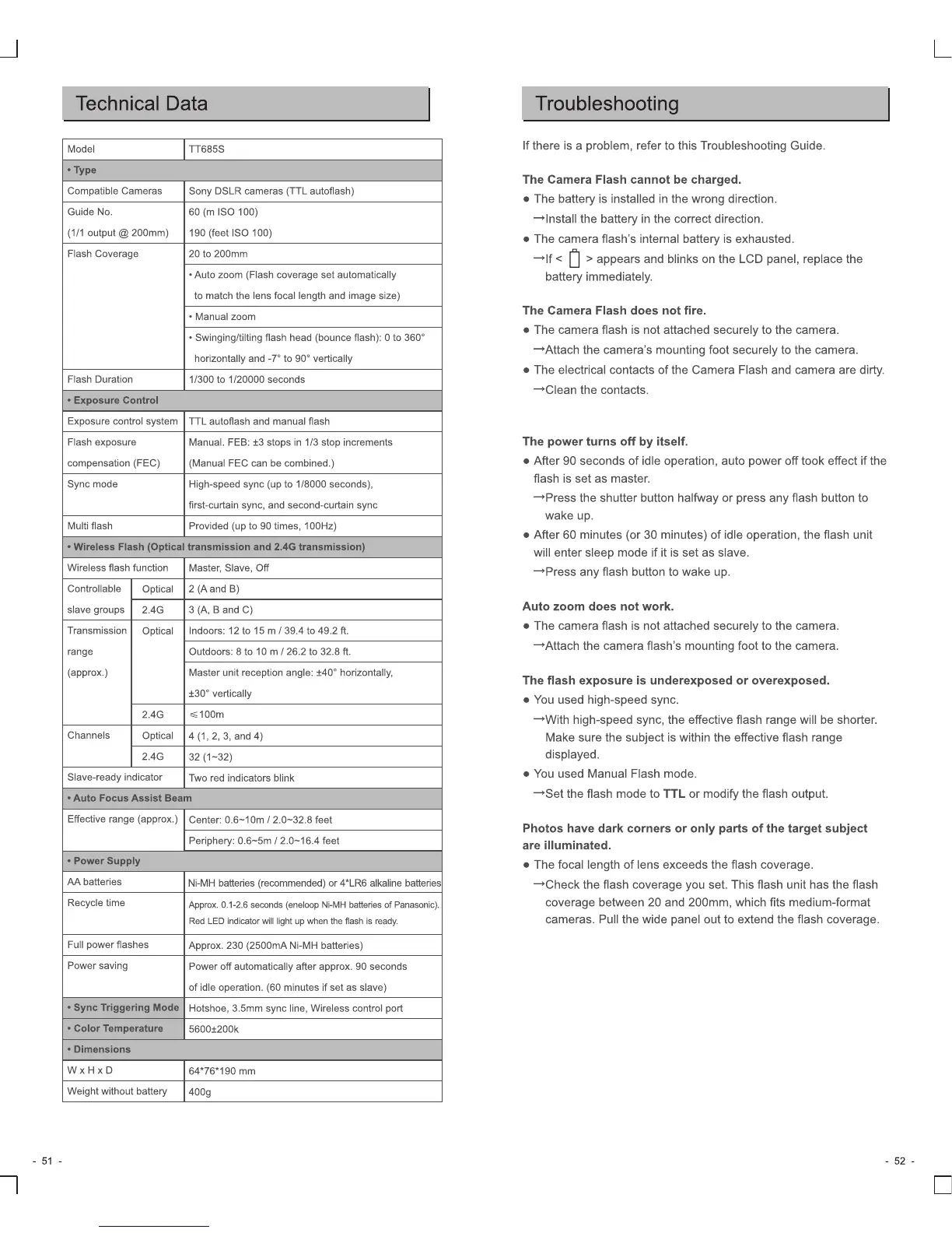 Godox TT685S - Troubleshooting; The Camera Flash cannot be charged; The Camera Flash does not fire; The power turns off by itself