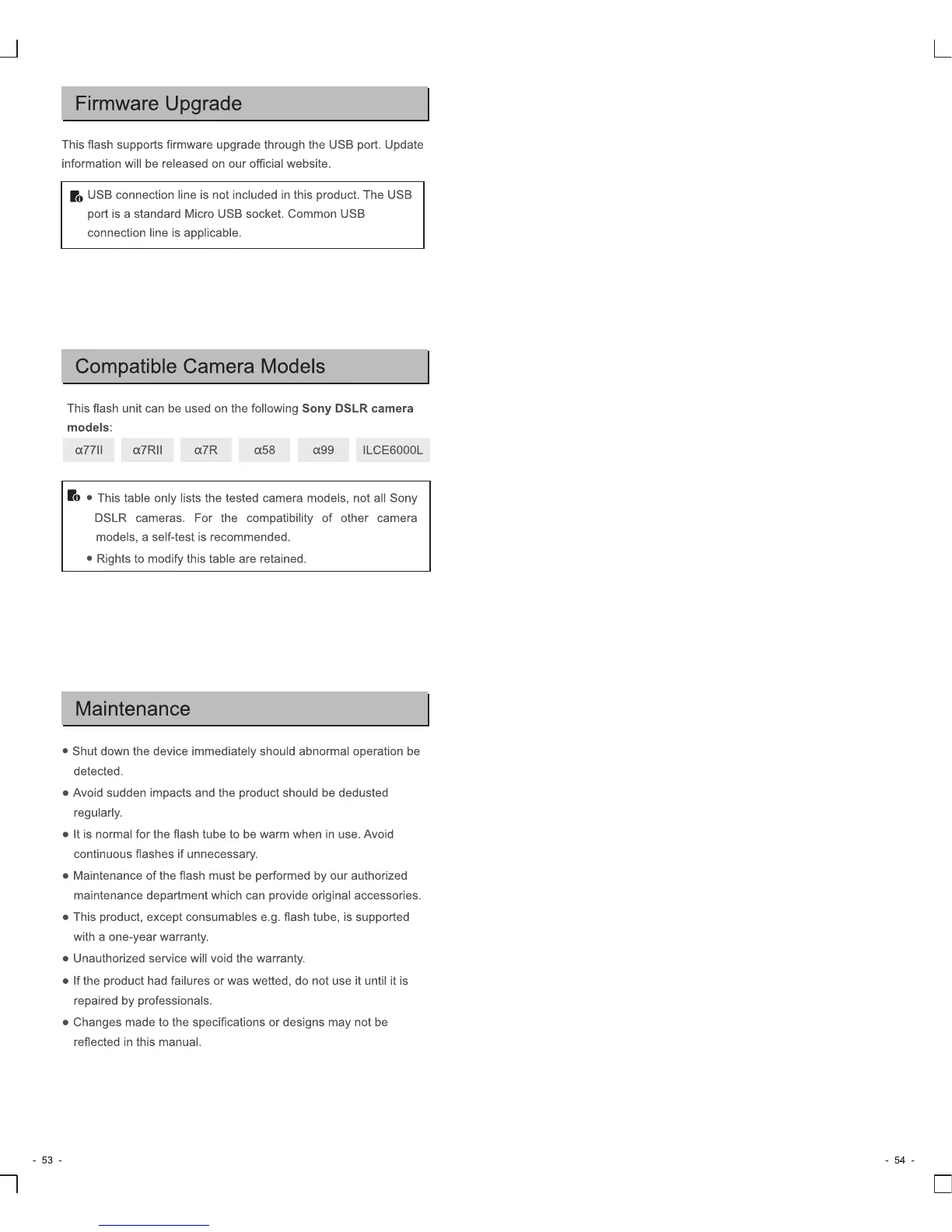Godox TT685S - Firmware Upgrade; Compatible Camera Models; Maintenance