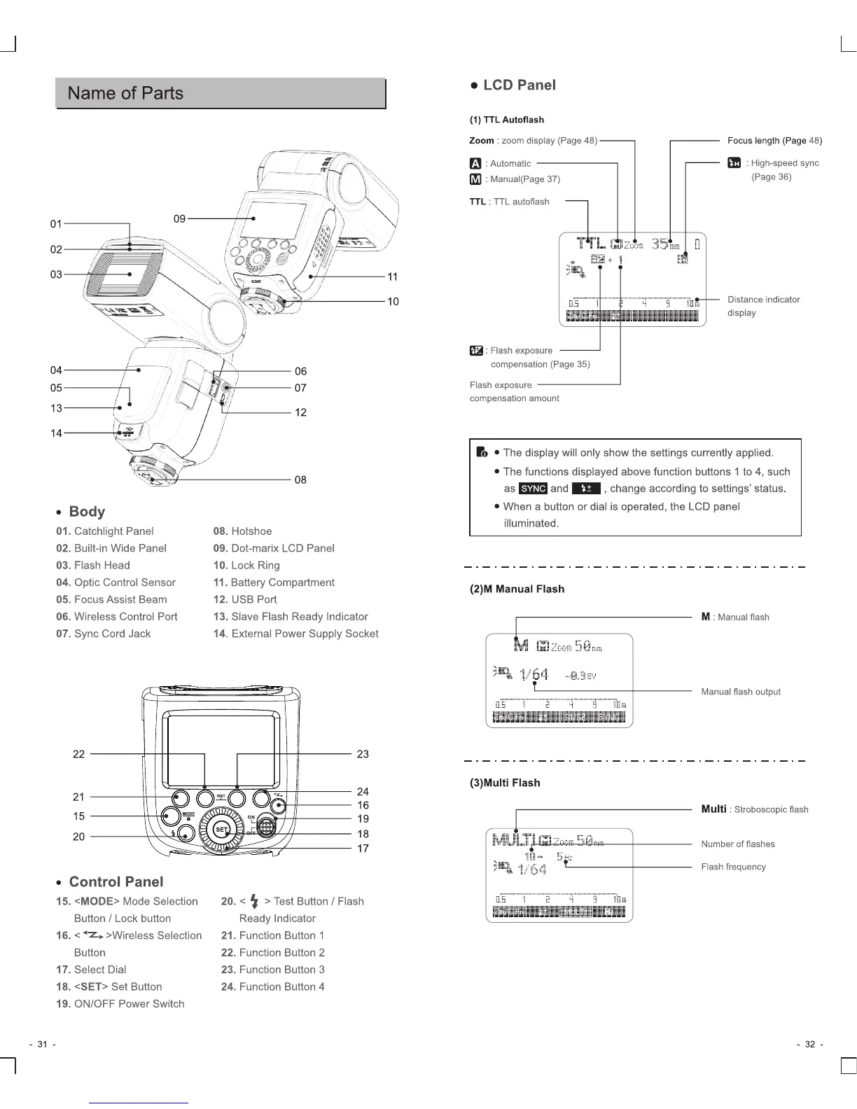 Godox TT685S - Name of Parts; Body; LCD Panel; Control Panel