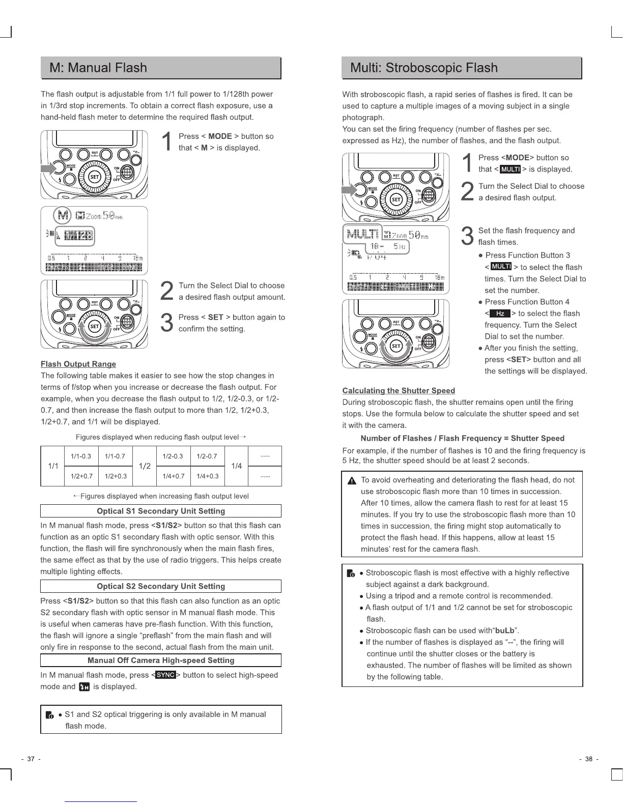 Godox TT685S - M: Manual Flash; Flash Output Range; Optical S1 Secondary Unit Setting; Optical S2 Secondary Unit Setting