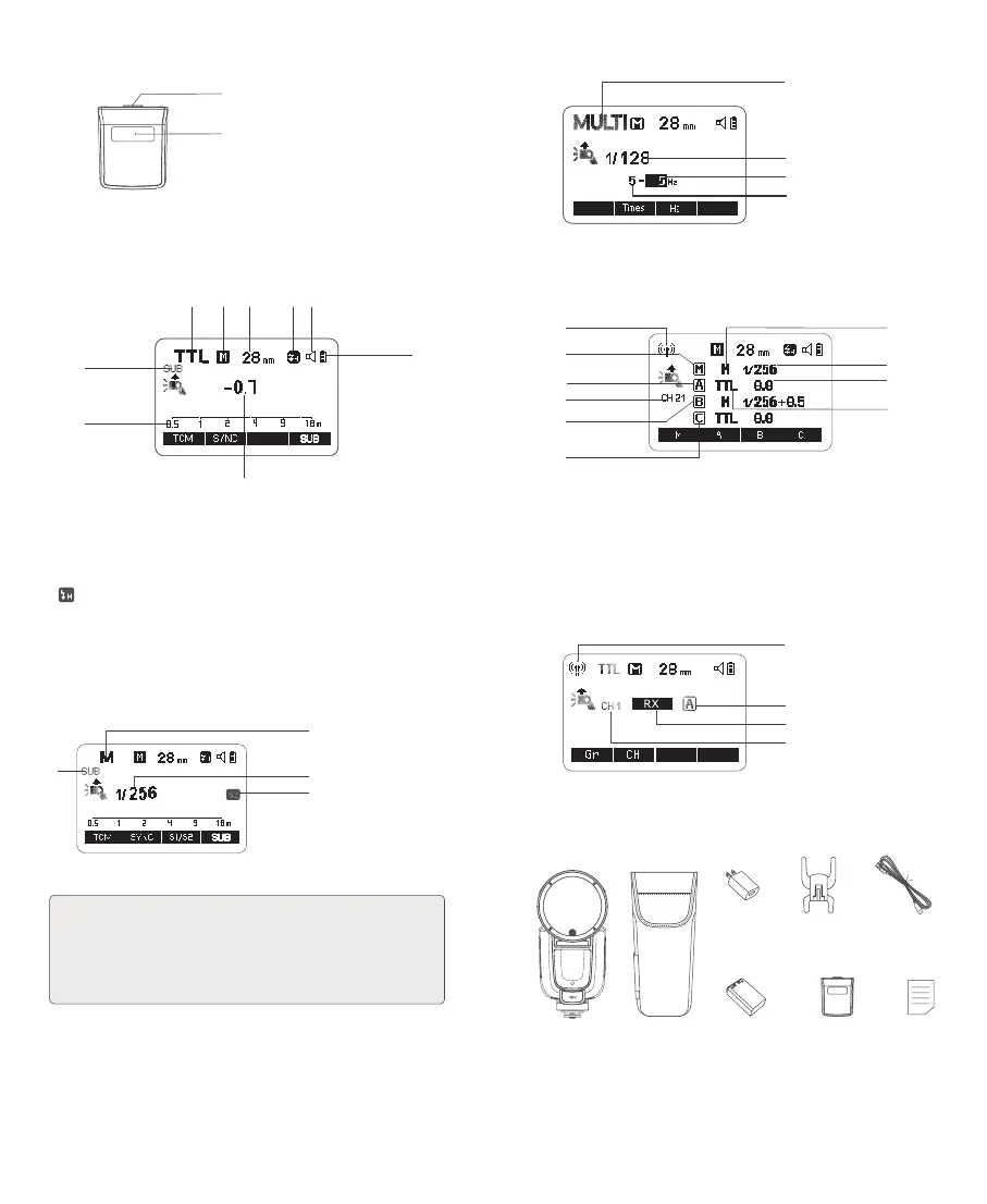 4. 机顶闪光灯 V1Pro O 需插入辅助闪光灯 SU-1, 界面才会显示 <SUB> 字符。