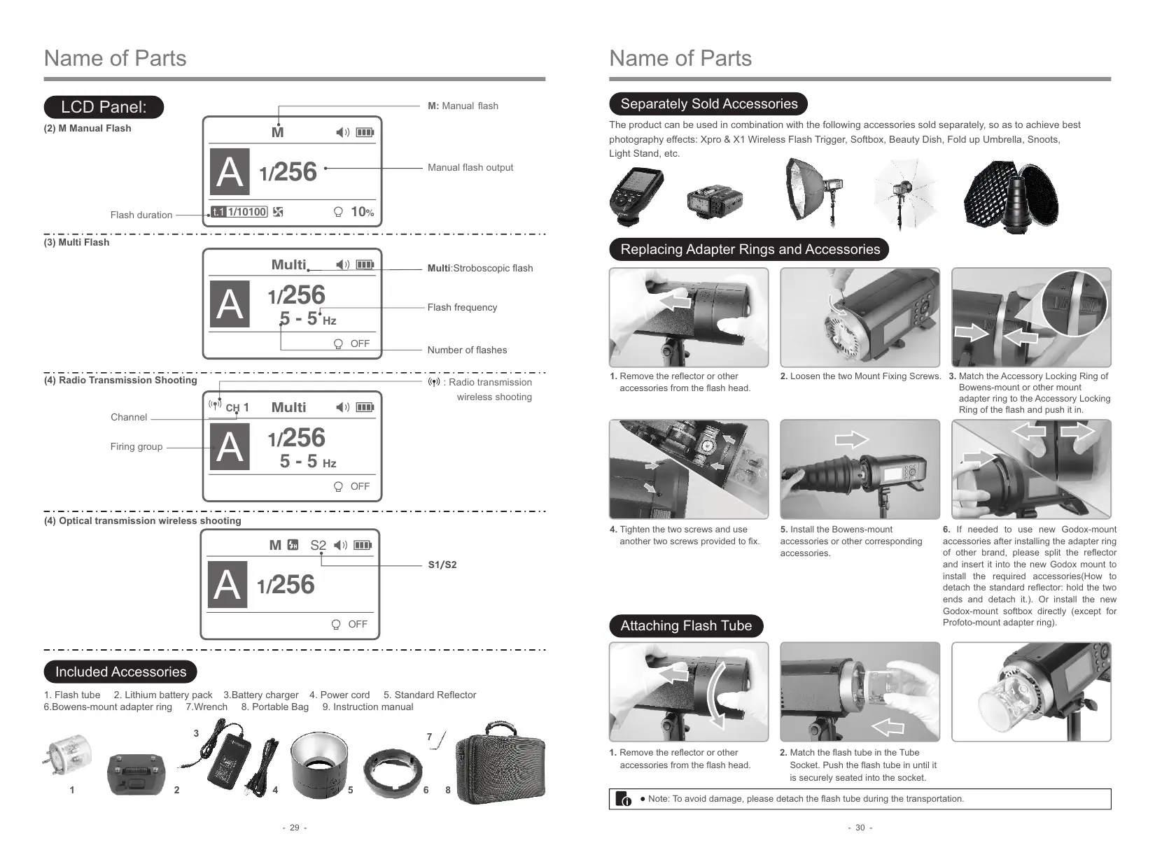 ● Note: To avoid damage, please detach the flash tube during the transportation.