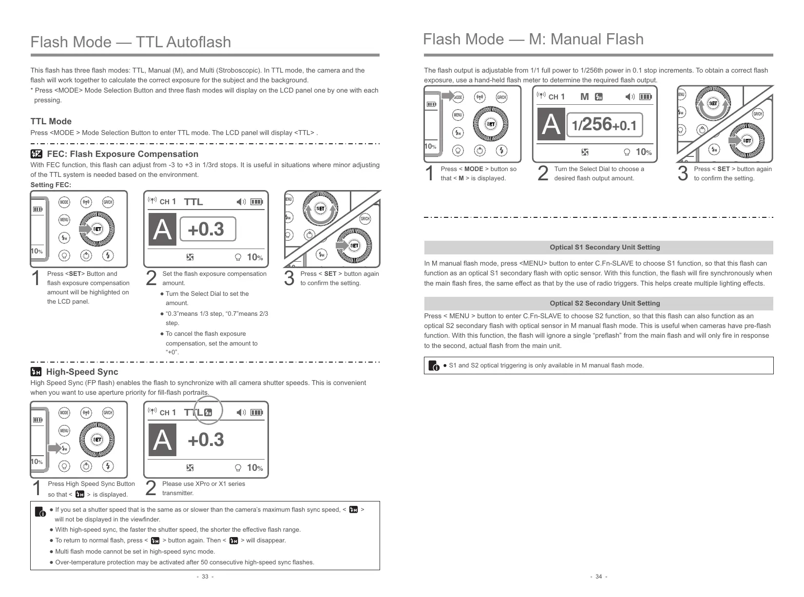 * Press <MODE> Mode Selection Button and three flash modes will display on the LCD panel one by one with each