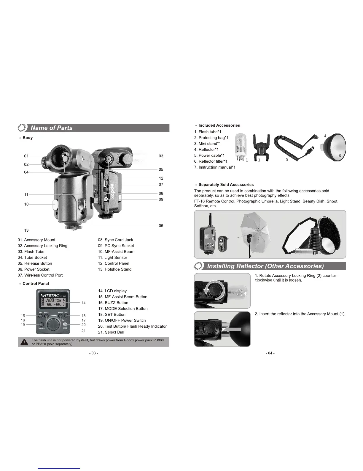 Godox Witstro+ AD180 - Name of Parts; Body Components; Control Panel Overview; Accessories