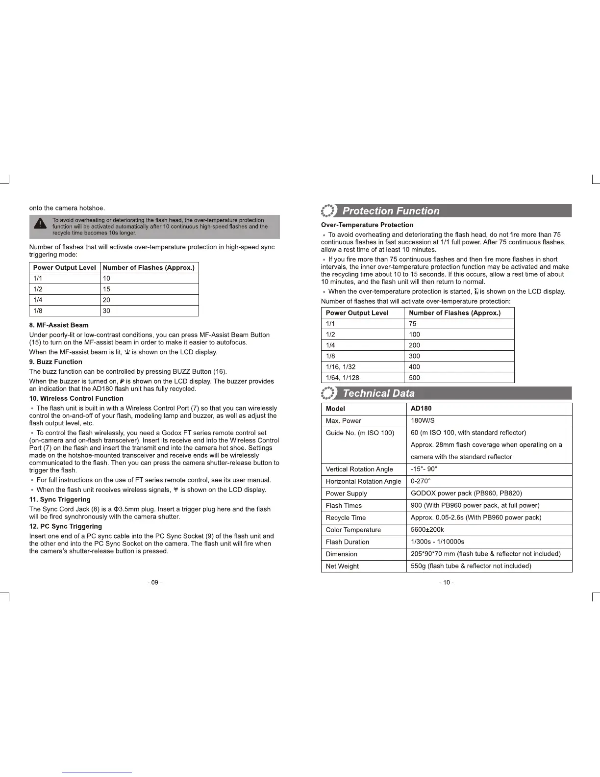 Godox Witstro+ AD180 - Protection Function; Over-Temperature Protection; Technical Data; Maintenance