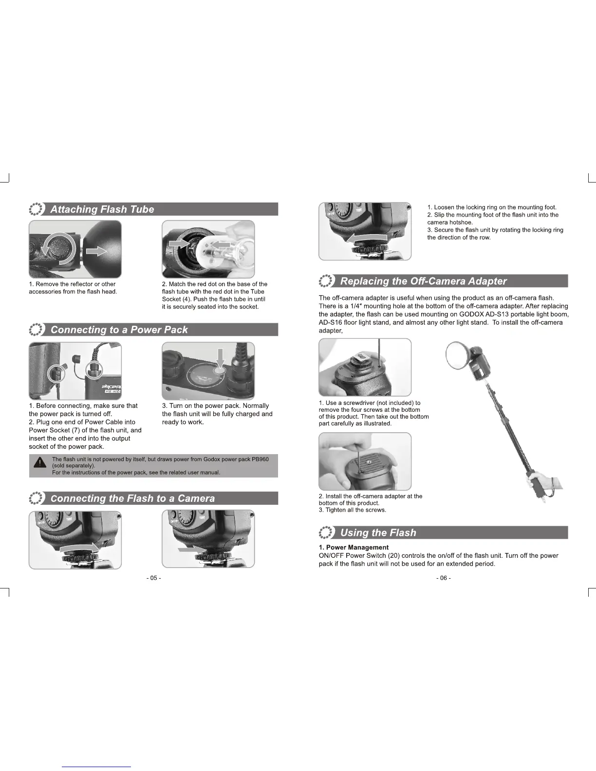 Godox WITSTRO+ AD360 - Attaching Flash Tube; Connecting to Power Pack; Connecting Flash to Camera; Replacing Off-Camera Adapter