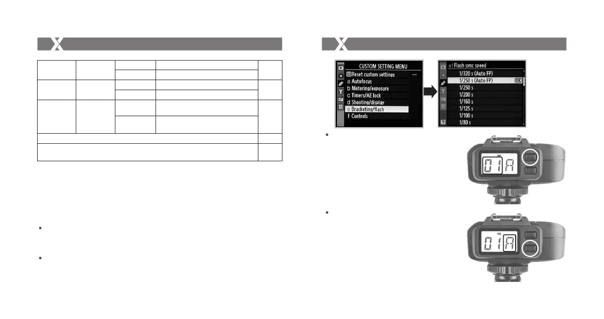 为使FP高速闪光,在相机上将个人设定“e1:闪光灯同步速度”设置为“1/250秒(自动