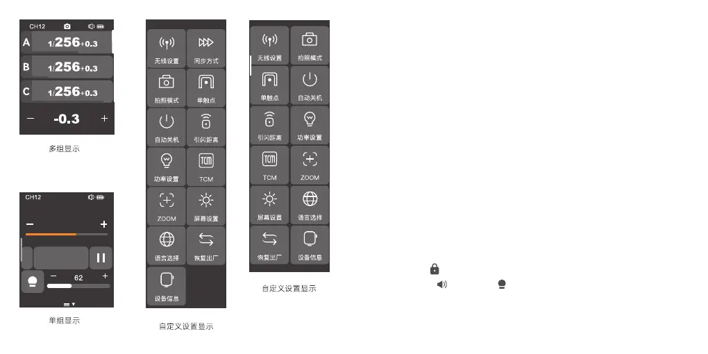 2. 处于主界面时,上下滑动可查看多组组别功率档位或闪光曝光值。