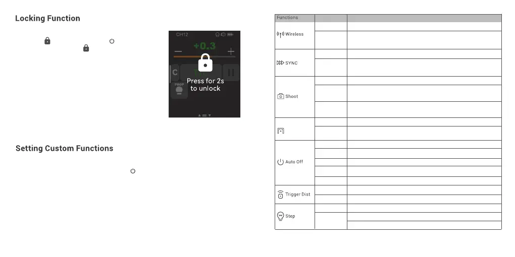 The following table lists the available and unavailable custom functions of this flash: