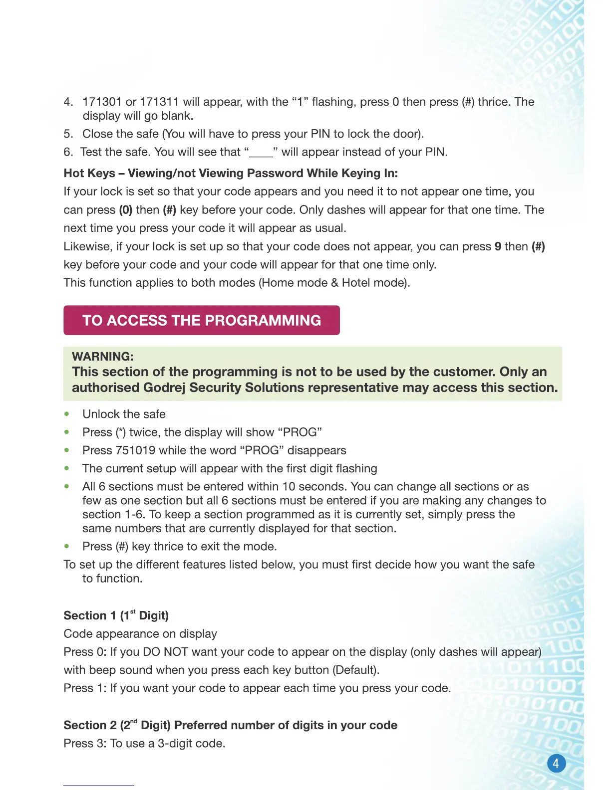 Godrej TAURUS - TO ACCESS THE PROGRAMMING; Section 1 (1 st Digit) Code appearance on display; Section 2 (2 nd Digit) Preferred number of digits in your code