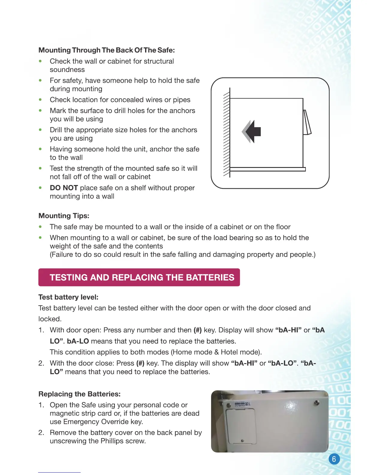 Godrej TAURUS - Mounting Through The Back Of The Safe; Mounting Tips; TESTING AND REPLACING THE BATTERIES; Test battery level