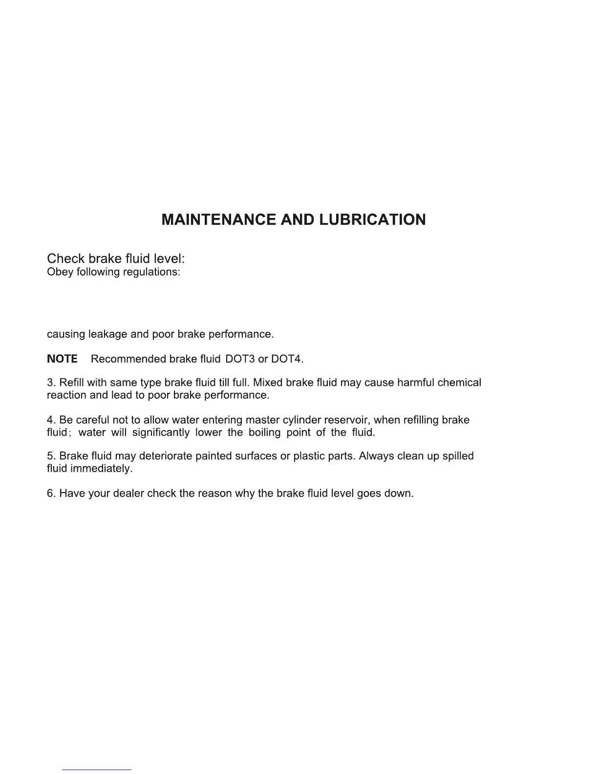 2. Use only designated quality brake fluid. Otherwise, the rubber seals may deteriorate,