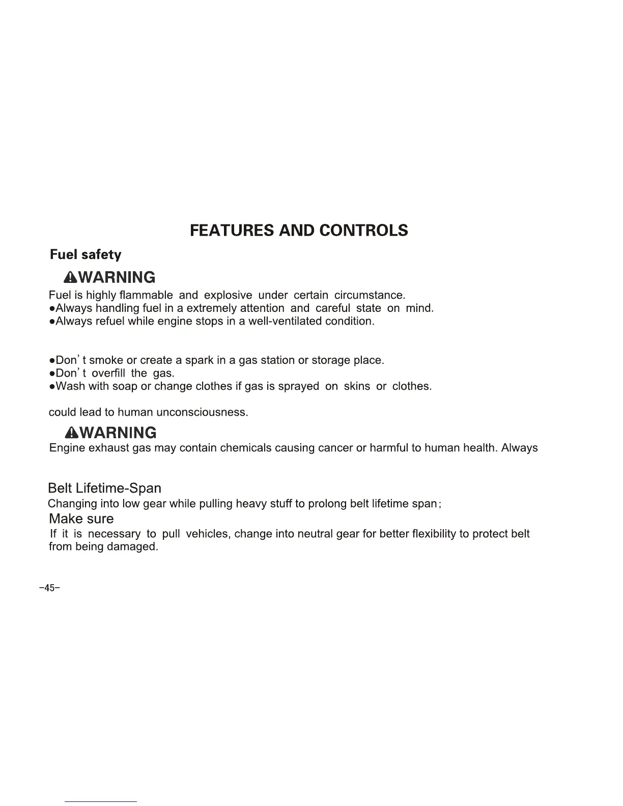 Don't start engine or run engine in a closed situation. Engine exhaust gas is poisonous and