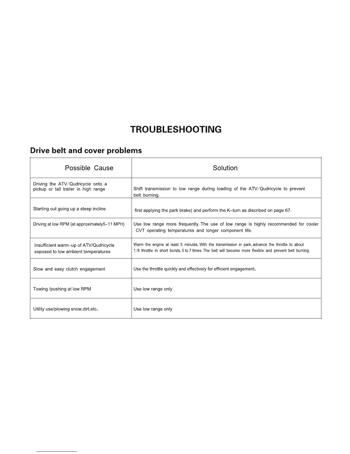 When starting out on an incline, use low range or dismount ATV/Quadricycle(after