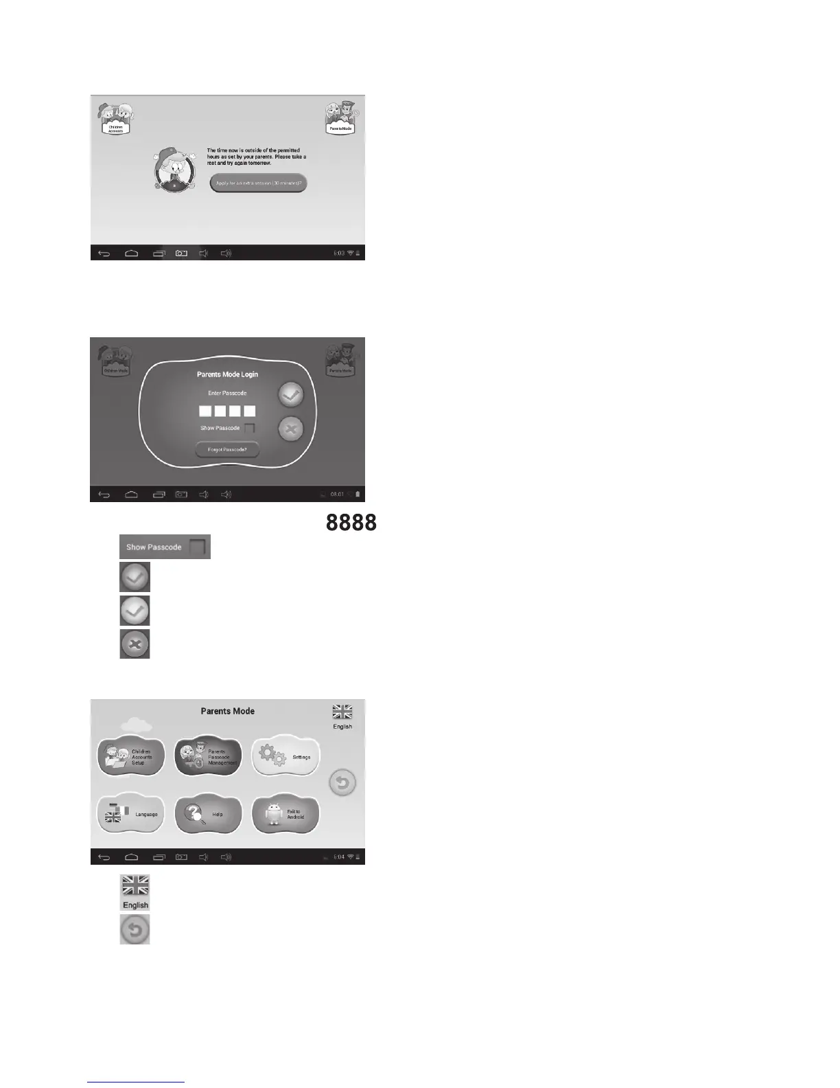 • Érintse meg a „Parents Mode” (Szülői mód) ikonját, adja meg a 4 számjegyű Szülői
