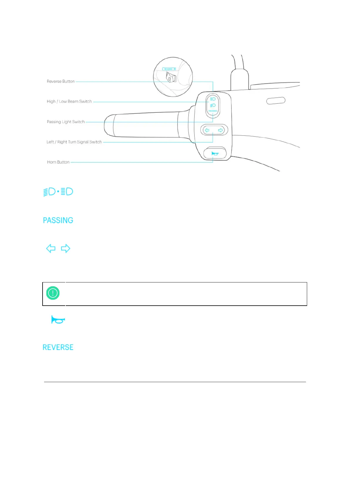 ● Under motor standby mode, press it and the scooter will reverse slowly with flashing