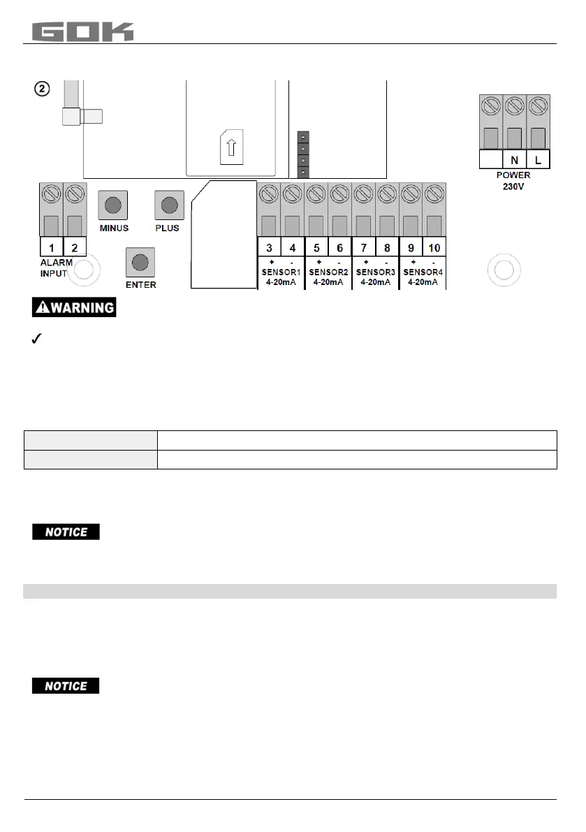 No 230 V AC connections may be made to terminals 3 + 4, 5 + 6, 7 + 8 and 9 + 10 or