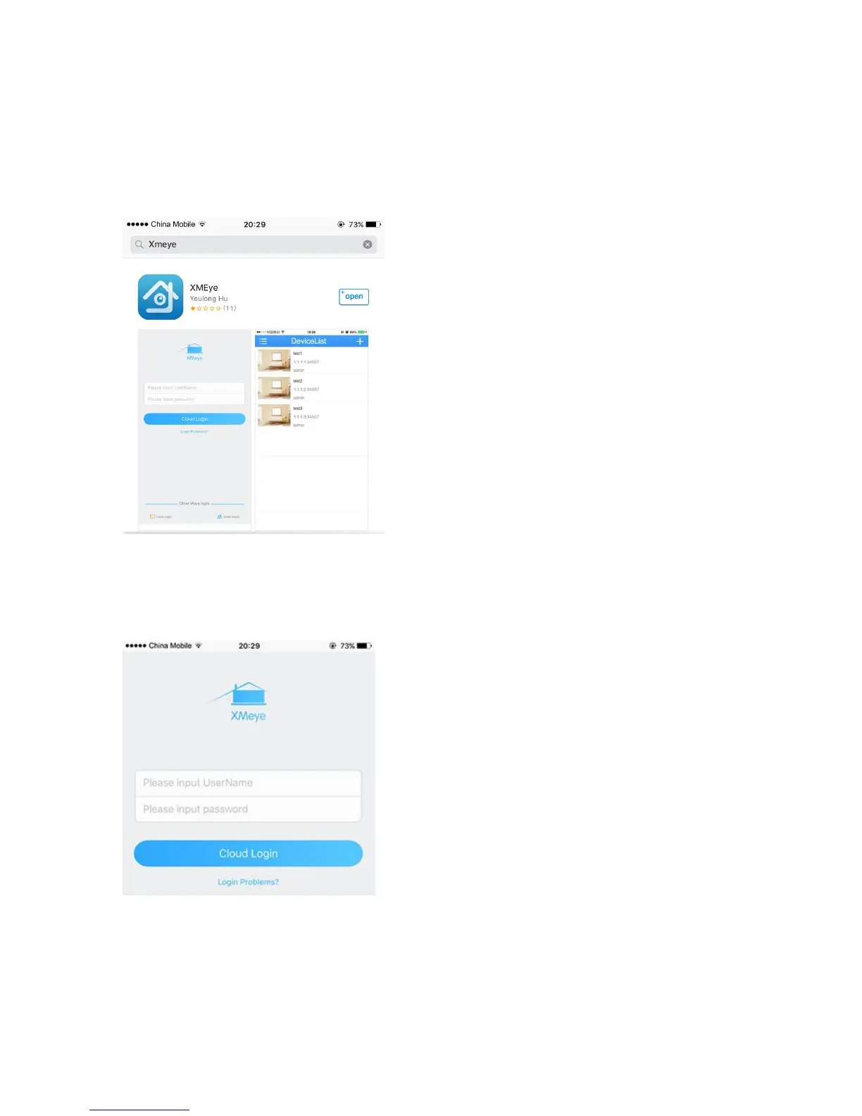1. Download: Search and install the app “XMEYE” in app store or Google play.