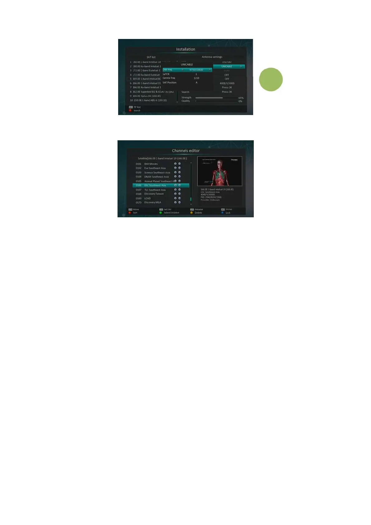 In the antenna setup menu, you must select the satellites available to you, set the corresponding